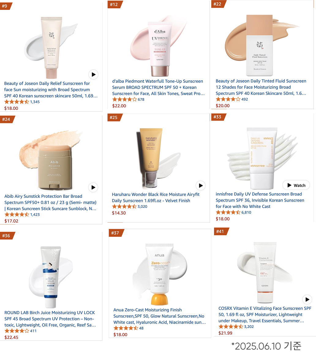 2025년 6월 2주차 기준, 아마존 Beauty & Personal Care 카테고리에서 K-뷰티 제품 9개가 전체 100위 안에 이름을 올렸고,