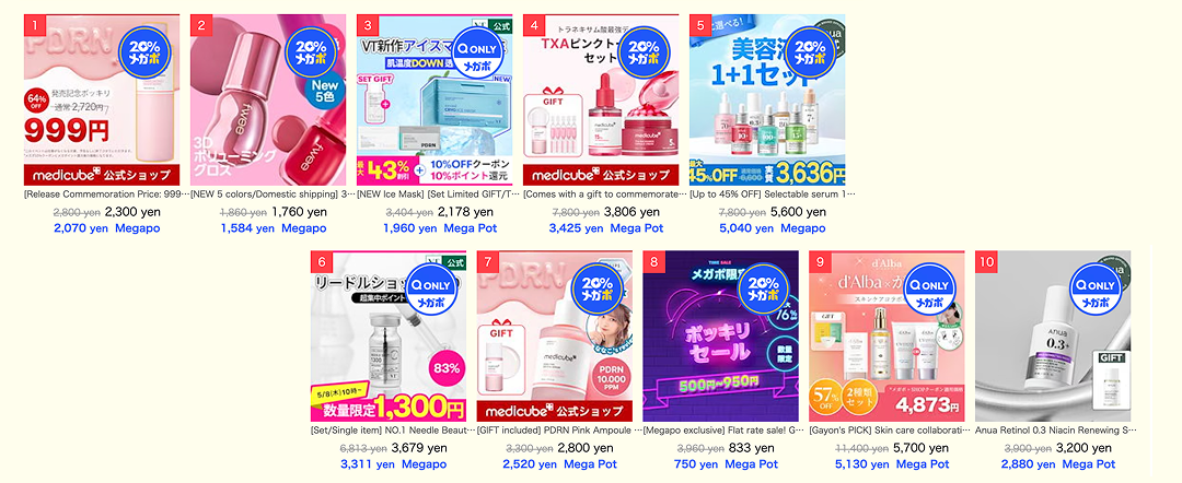 라쿠텐(48.2%), 앳코스메(45.8%), 아마존(40.9%)도 주요 채널이지만, 큐텐이 독보적인 1위를 차지한 이유는 가격 경쟁력과 메가와리(대형 할인 행사) 때문이에요.