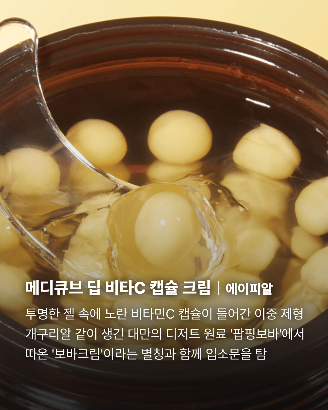 메디큐브의 ‘딥 비타C 캡슐 크림’은 노란색 캡슐이 젤 안에 들어 있는 이중 제형으로, 대만 디저트 ‘팝핑보바’를 연상케 한다는 의미에서 ‘보바크림’이라는 별칭으로 불리며 입소문을 탔습니다.