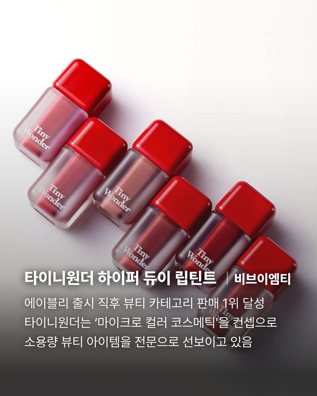 비브이엠티(VBMT)의 ‘타이니원더 하이퍼 듀이 립틴트’는 에이블리 출시 직후 뷰티 카테고리 판매 1위를 달성했어요.