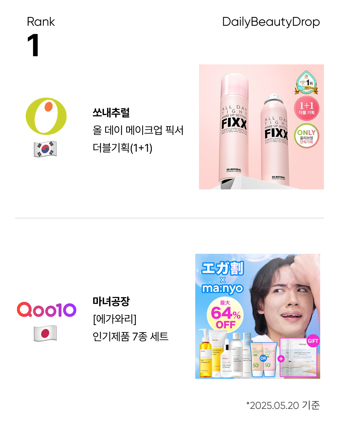 올리브영 1위는 쏘내추럴 '올 데이 메이크업 픽서 더블기획(1+1)', 큐텐재팬 1위는 마녀공장 ‘메가와리’ 인기제품 7종 세트였습니다.