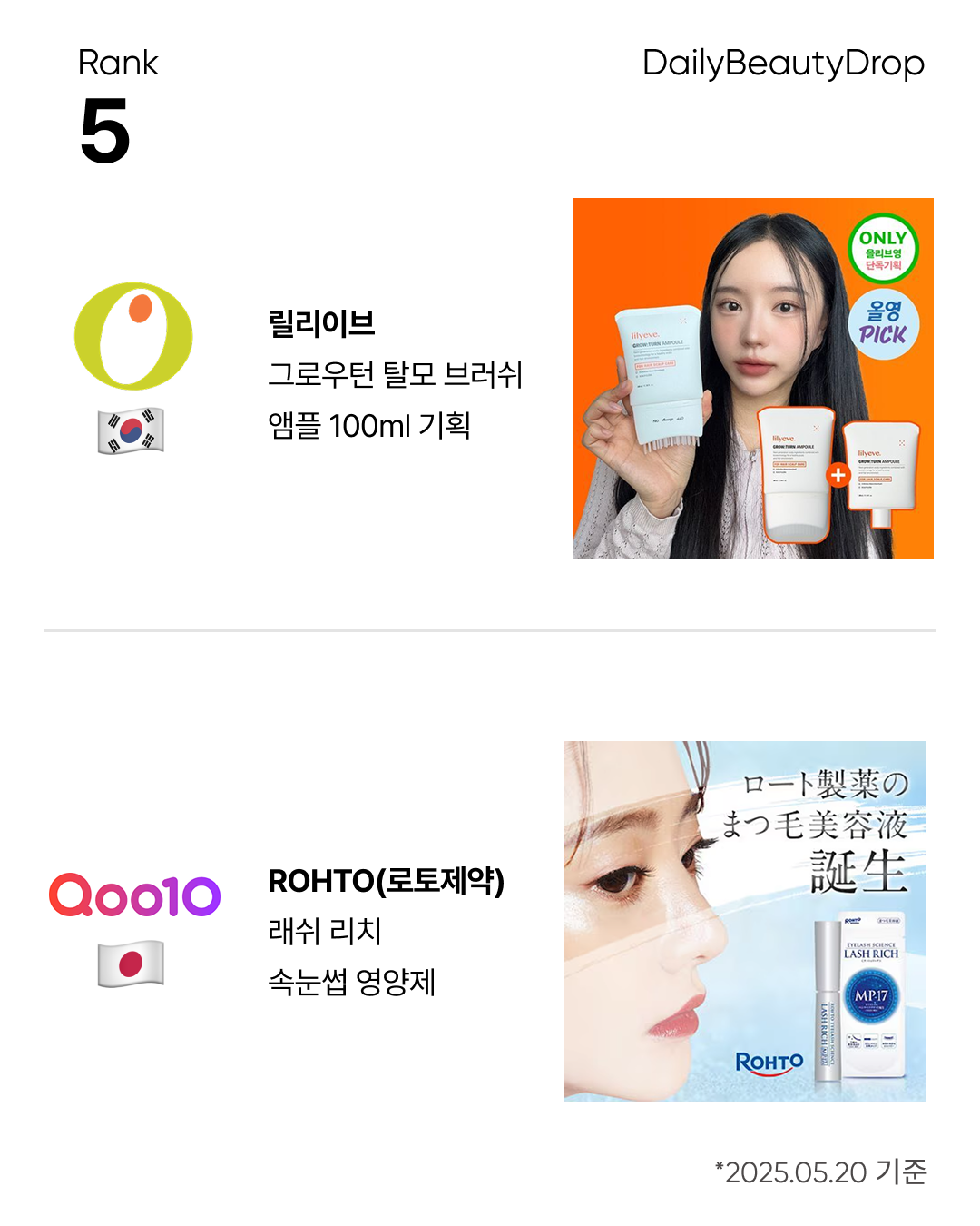 5위에는 릴리이브 그로우턴 탈모 브러쉬 앰플 (올리브영), ROHTO(로토제약) 래쉬 리치 속눈썹 영양제 (큐텐재팬)가,