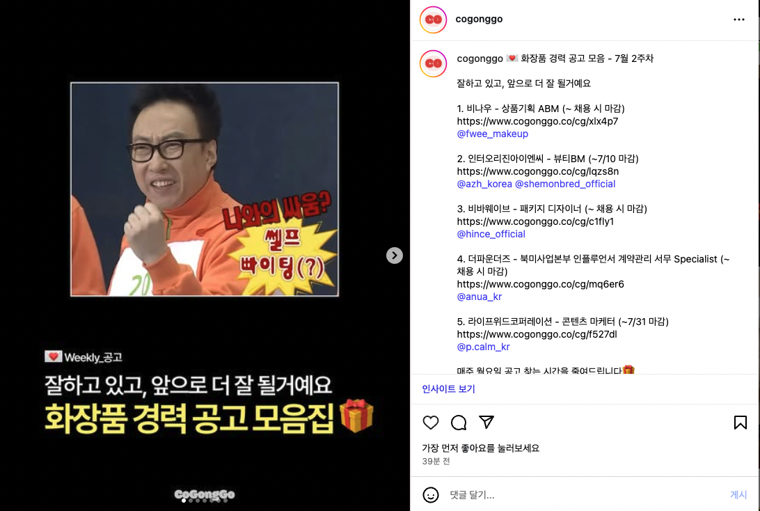 매주 월요일, 가장 새로운 뷰티공고를 만나려면 코공고 인스타그램을 팔로우하세요!
